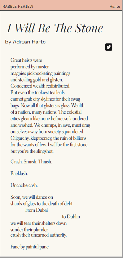 I was recently published by the California leftist ezine Rabble Review, the strident, not always metaphorical, I Will Be The Stone.